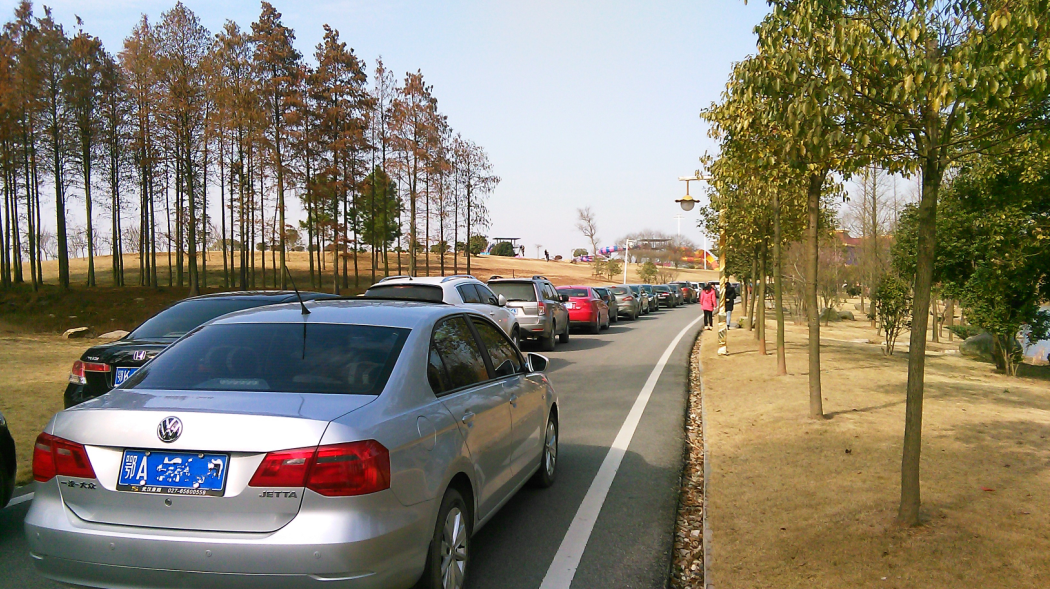 (圖為各地車(chē)輛等待進(jìn)入景區(qū))