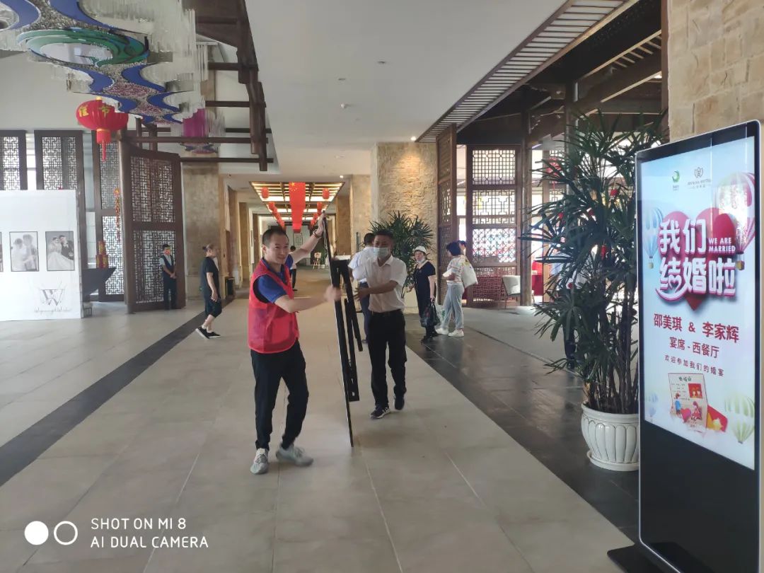 今天是國慶假期的第四天,金灣酒店也迎來了婚宴的高峰期,為確保金灣酒店打響本地婚慶市場特色品牌,洪旅集團積極組織本部12名志愿者支援金灣酒店,“志愿紅”成為金灣酒店一道美麗的風景。