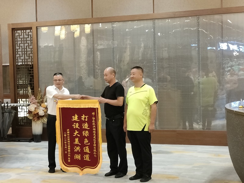 8月1日下午,洪湖市汊河鎮(zhèn)、濱湖辦事處和市交警大隊的領(lǐng)導(dǎo)和村民代表將分別寫有“綠道串連資源大發(fā)展 助推鄉(xiāng)村振興譜新篇”“修通致富路 架起連心橋”“情系老區(qū)建美麗洪湖 造福百姓鋪暖心公路”“打造綠色通道 建設(shè)大美洪湖”的錦旗送到綠道公司,表達村民群眾和交通干警對洪湖市環(huán)湖綠道項目全面建成的認可和稱贊。