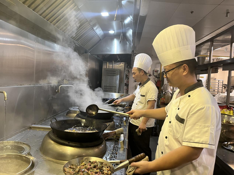 餐飲服務(wù)中心的大廚們?cè)跓釟怛v騰的廚房里忙碌著,精準(zhǔn)地把握火候,精心調(diào)味,一道道美味佳肴新鮮出爐。服務(wù)人員穿梭在餐廳中,微笑著為游客上菜、添水,時(shí)刻關(guān)注著賓客的需求。