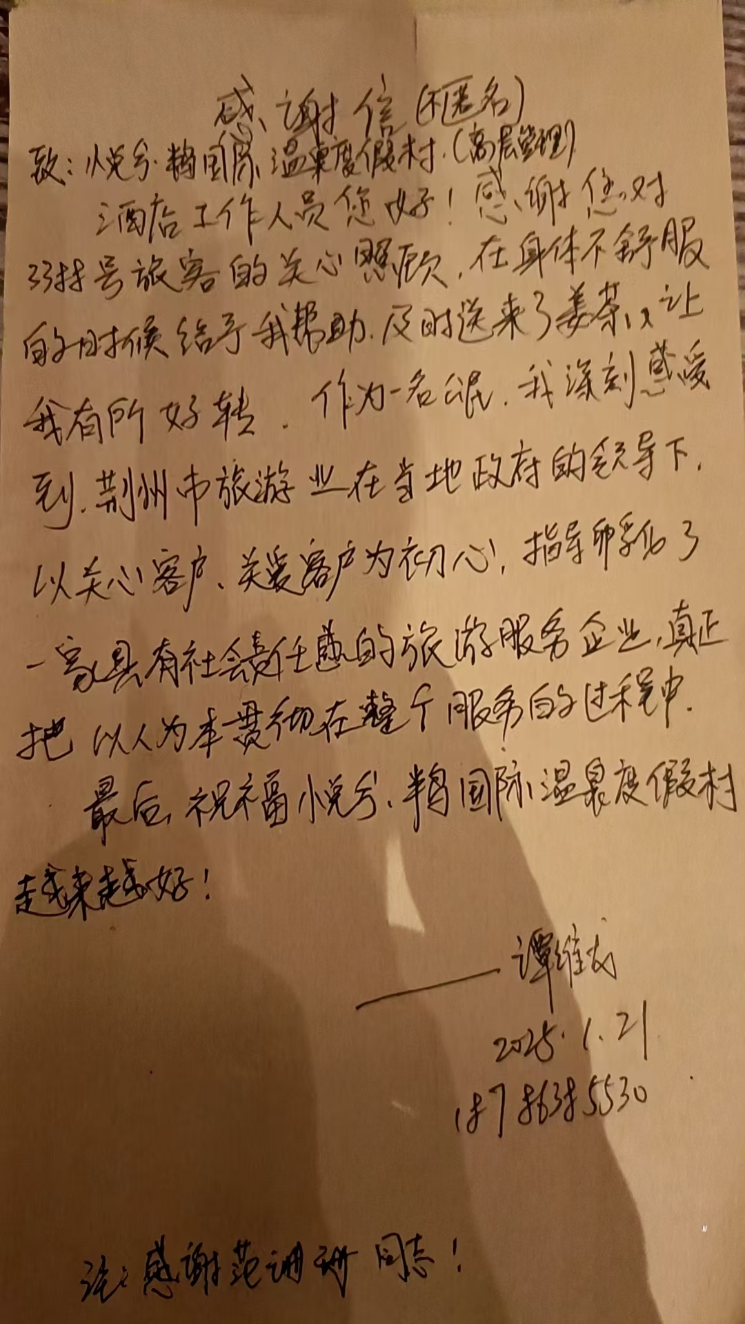 1月20日凌晨5點左右,酒店3388房間的客人譚先生因發(fā)燒身體不適,打電話向酒店前臺求助。接到電話的前臺工作人員范珊珊,第一時間向客人表達了關心與問候。在詢問客人是否需要前往醫(yī)院時,了解到客人希望此時能有一杯熱飲緩解不適,范珊珊安撫好客人后,立刻前往廚房尋找生姜和紅糖,并在工作間親手煮好姜茶,迅速送到客人房間。她的貼心服務讓客人深受感動。當天上午10點左右,身體有所好轉的譚先生特意來到酒店前臺,親手寫下感謝信,當面感謝范珊珊給予的幫助。