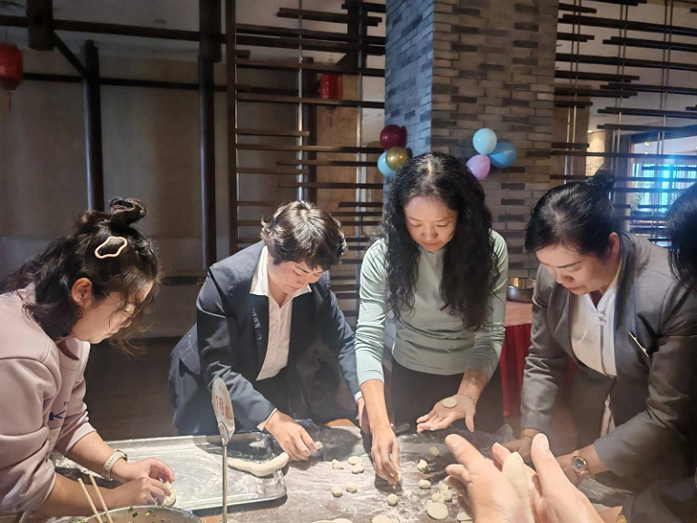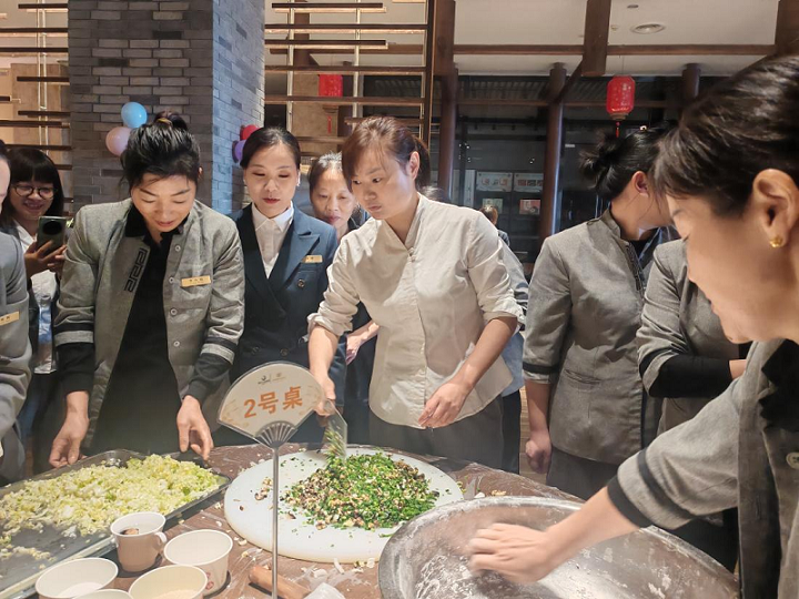 下午13:30,活動(dòng)準(zhǔn)時(shí)開場(chǎng)。員工們分為四個(gè)小組,餐飲組、客房組、營(yíng)銷景區(qū)組和綜合組在各自組長(zhǎng)的帶領(lǐng)下,開啟包餃子大戰(zhàn)。大家洗凈雙手,圍坐在桌前,有人負(fù)責(zé)揉面,面團(tuán)在他們的手中不斷翻滾,變得光滑有彈性;有人負(fù)責(zé)搟皮,搟面杖在面板上輕快地滾動(dòng),一張張薄厚均勻的餃子皮快速成型。包餡的員工們更是各顯身手,把豬肉、白菜、韭菜、香菇等餡料巧妙地包裹在餃子皮中,有的捏出精致的花邊,有的包成小巧的元寶形狀。每組 10 人齊心協(xié)力,配合默契,歡聲笑語(yǔ)回蕩在大堂吧。
